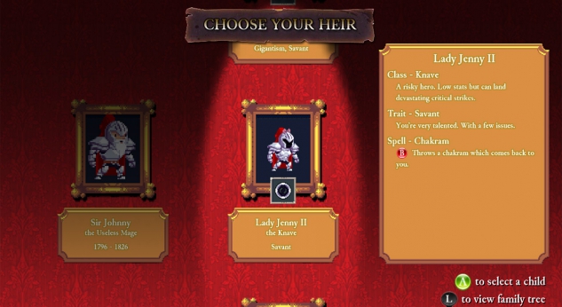 Pour rappel, Rogue Legacy est un rogue like faisant parcourir à votre personnage les salles d'un château. Au travers de quatre zones distinctes, le héros devra y trouver et y vaincre les quatre gardiens qui protègent la porte vers le traître, ayant assassiné le roi. Naturellement, à chaque nouvelle tentative, l'ensemble de l'agencement des pièces variera ! La particularité du jeu résidait dans le système de mort, puisque lorsque vous échouiez dans le dédale, c'était l'un des trois enfants du héros qui prenez la relève afin de tenter de réussir à son tour la quête de son défunt parent. Chaque descendant était laissé au choix du joueur en fonction de traits physiques ou de caractères propres influant sur le gameplay, ou sur sa classe de combat. A chacun sa préférée parmi les neuf disponibles, composées entre autre, du paladin, du barbare, du magicien, de l'assassin ou de l'hokage.