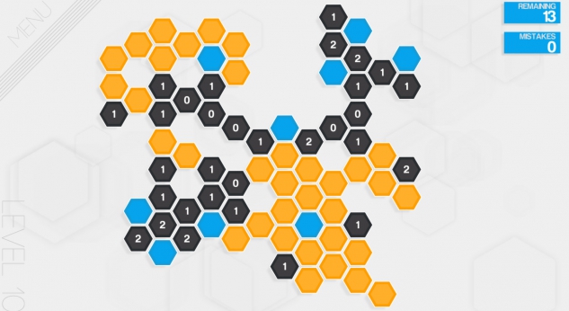 Contrairement à son premier modèle, Hexcells nous propose des tableaux faits d'hexagones. Le but est ici d'identifier un certain nombre de polygones à marquer en bleu, sans se tromper, en suivant les indications qui nous sont données. Une case chiffrée, nous renseigne sur le nombre d'éléments adjacents à colorer en bleu. Par exemple, si vous voyez un hexagone à l'intérieur duquel est indiqué le chiffre 4, cela signifie que vous aurez à colorier autant de figures qui lui sont collées avec le clic gauche de la souris. Lorsque vous avez la certitude qu'une case n'est pas à colorier, vous pouvez alors la sélectionner avec le clic droit, afin de révéler un chiffre sur cette dernière. Et c'est en enchaînant tout ça que vous viendrez petit à petit à bout des niveaux qui vous sont proposés.