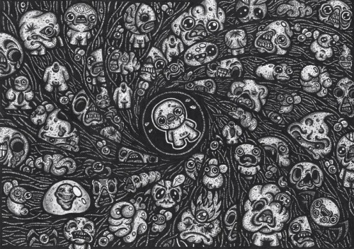 Avec son univers sombre, glauque et assez cracra, Isaac navigue généralement selon les interprétations dans son propre esprit, à la recherche de la rédemption. Cela le mène à croiser ce qui semble lui faire peur, à savoir du caca, des araignées, des mouches, et ou des versions mortes de lui-même plus ou moins transformées, lorsque ce ne sont pas carrément ses parents ou Satan auxquels il doit faire face. S'étant imposé comme l'un des plus grands symboles du jeu indé de ces dernières années avec d'autres, cette ambiance à su toucher un grand nombre de joueurs et, parmi eux, des artistes avec un talent surprenant. Voici une petite sélection de quelques unes des œuvres réalisées. Cliquez sur les images pour accéder à leurs auteurs.