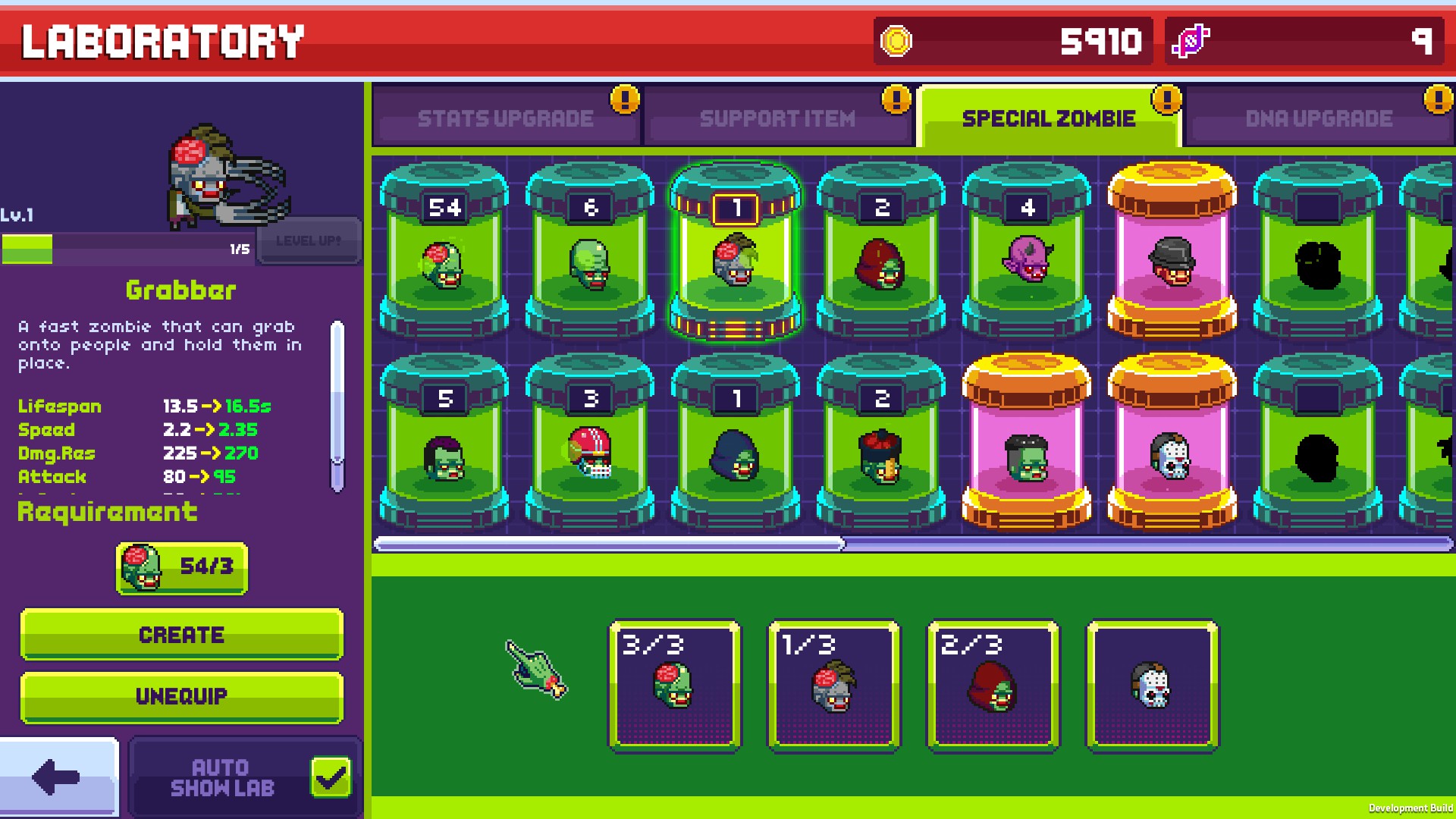 A partir de là, le zombie créé tentera de tuer autour de lui la population et pourra ponctuellement transformer quelques personnes. Si la mission ne sera réussie qu'avec l'élimination de tous les présents, de l'expérience sera en revanche gagnée quoiqu'il arrive et pourra être dépensée pour améliorer ses créatures en terme de durée de vie, de puissance, de taux de contamination et quelques autres statistiques. L'achat d'objets à utiliser durant les niveaux pourra également sauver quelques tentatives à mesure qu'on amassera davantage de ressources.