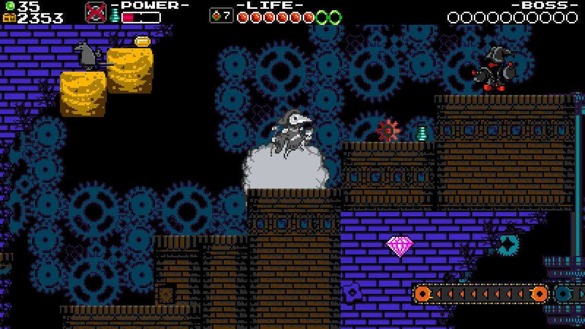 Pour faire simple, cette nouvelle campagne double réellement la durée de vie du jeu. Non seulement le joueur devra parcourir à nouveau tous les donjons précédemment découverts avec Shovel Knight, mais il aura aussi un grand nombre de collectables à dénicher. On retrouvera les parchemins de musique bien connus, mais également des pièces vertes qui permettront d'améliorer un magasin de potions, ou encore les fameuses reliques que Shovel Knight trouvera plus tard, qu'on échangera en faveur de reliques spécifiques à Plague Knight. On repartira donc fouiner à la recherche de nouveaux secrets dans les zones qu'on pensait connaitre, mais qui profitent de variations à la fois nécessaires pour s'adapter au gameplay de notre nouveau héros, ainsi que de zones secrètes lui étant totalement dédiées.