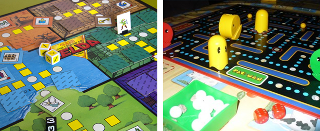 Avant toute chose. rappelons quand même qu'il fut un temps où, aux côtés de notre cher Monopoly faimilal, trônait parfois une boite de jeu Tetris ou encore Pac-Man. Règles rudimentaires, visuel old-school ; ces premières adaptations de jeux vidéo en jeu de société ont été pour quelques joueurs l'occasion de redécouvrir leurs mascottes virtuelles favorites dans un format matériel. Par exemple, le jeu The Legend of Zelda (oui, oui !) propose une version très simplifiée du concept dont il est la conversion. On y incarne un héros qui devra évoluer de salle en salle en récupérant les objets adéquats via la pioche qui peut également contenir des combats de monstres. Cartes, pions, plateau comportant 6 pièces de donjon : le tout est visuellement accrocheur et fidèle à l'univers de Zelda en proposant des règles accessibles. Car oui, la cible de ce genre de jeux reste avant tout le jeune enfant tombé sous le charme de la NES de Nintendo.
