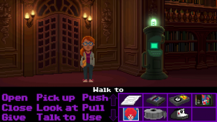 Les multiples actions dispo permettent d'éviter de simplifier les interactions, ce qui peut aboutir dans les jeux récents à ce qu'on résolve des énigmes "sans faire exprès". A partir de Monkey Island il me semble il existe par ailleurs un système d'action rapide: lorsqu'on pointe sur un élément actif une des actions du menu apparait en surbrillance (p.ex. "ouvrir" pour une porte, "parler" pour un personnage, etc.) et un double-clique permet de la lancer, ce qui fluidifie nettement le jeu. Bref, s'il est vrai qu'on peut regretter qu'elle empiète sur la représentation graphique de l'action à l'écran, ce type d'interface n'est pas dénuée d'un certain intérêt. Même s'il est vrai que les choses pourraient surement être modernisées quand même :/.