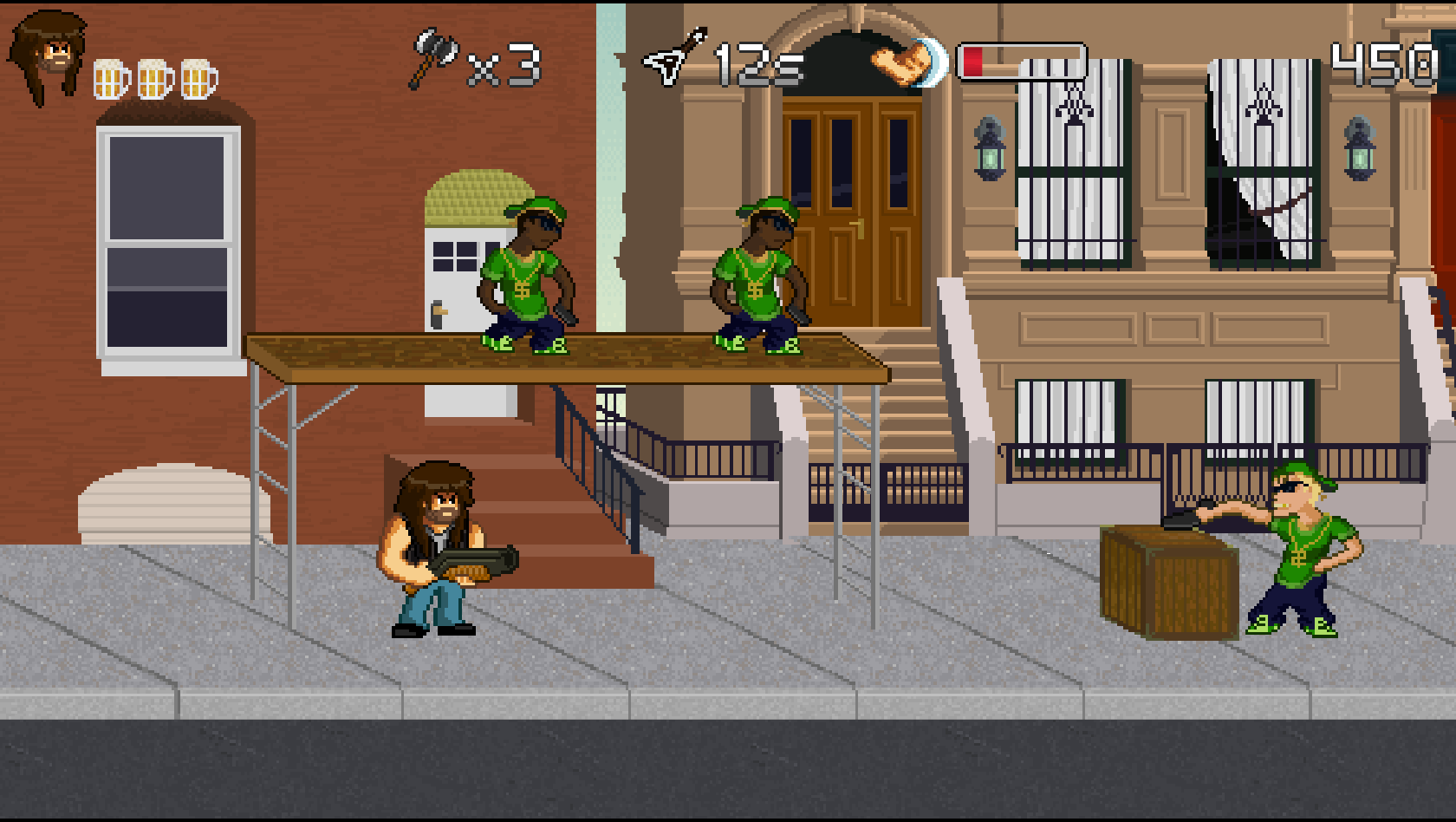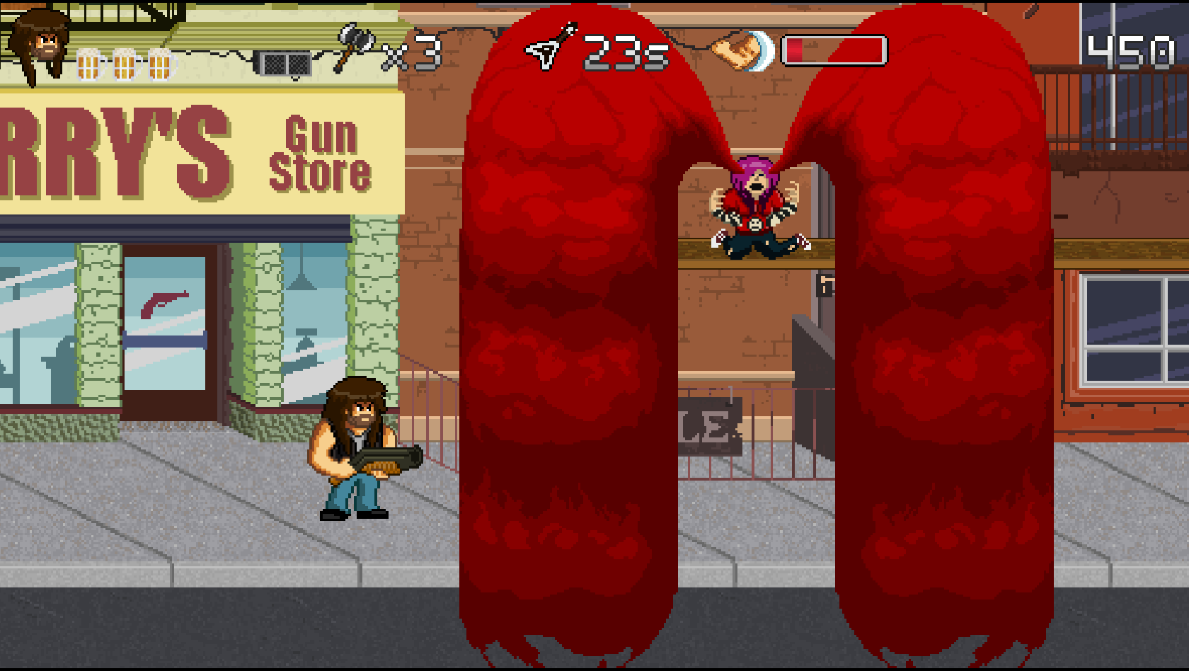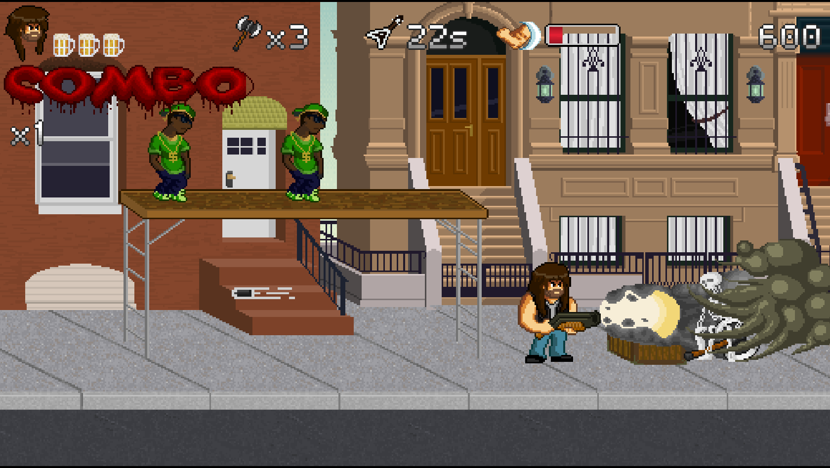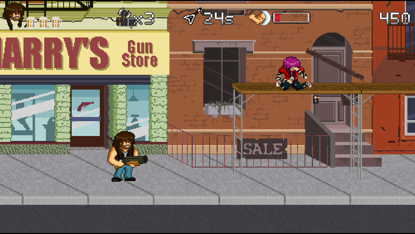 B for Badass est un jeu de type run'n gun qui met l'accent sur le scoring et le skill ! Avec la musique comme thématique principale, à vous de dézinguer les gens qui ont volé la bière du héros que vous contrôlez : Garett B. Hustain.