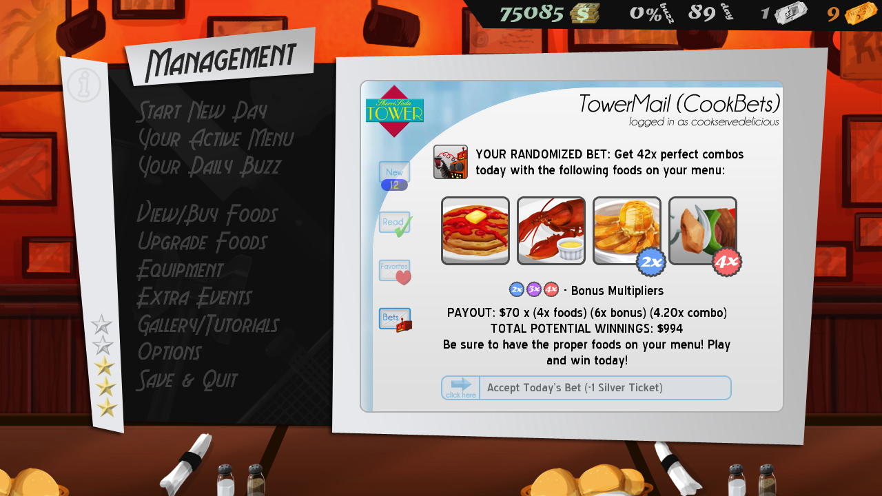 Cook, Serve, Delicious n'est pas un jeu qui plaira à la majorité. Sous ses airs de titre pour joueur occasionnel, et malgré la répétitivité des phases de cuisine, il propose tout de même une belle progression au travers de la partie gestion. Avec une patte graphique colorée et sans chichi, ce titre s'avère de plus en plus complexe au fil des heures et pourra intéresser le passionné de restauration qui sommeille en vous ! Choisissez vos plats, entraînez vous, améliorez les et servez les avec soin pour devenir le nouveau Paul Bocuse avec ce titre qui vaut son pesant de cacahuètes !