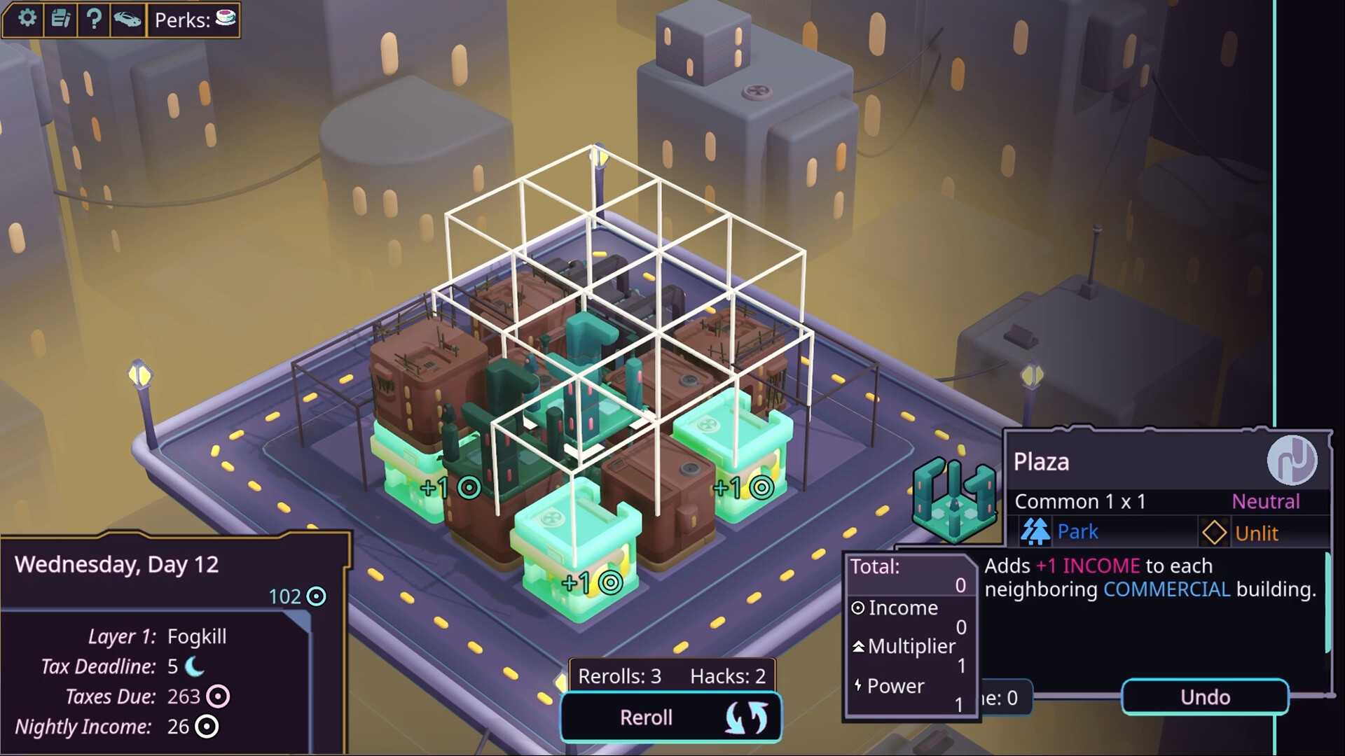 Neongarten est un city builder cyberpunk minimaliste s'inspirant d'Islanders et de Luck Be a Landlord.