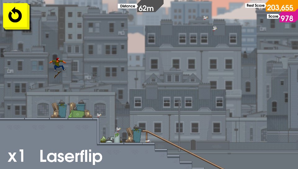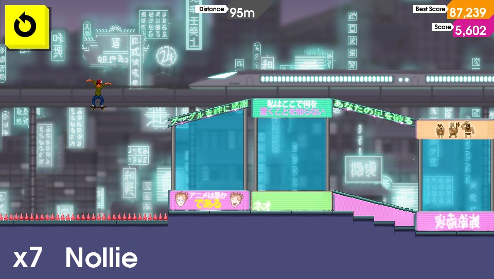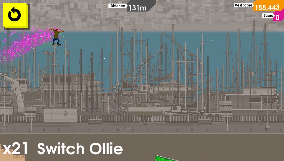 C'est armé de patience et d'un solide skateboard que le joueur doit apprendre à maîtriser l'art du scoring dans Olli Olli. Grinds, 360° et figures seront à enchaîner pour accomplir de nombreuses missions dans cinq environnements de plus en plus difficiles à parcourir sans se prendre un bon gadin !