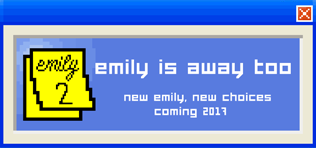 L'annonce vient d'être faite, un nouvel épisode est en préparation. Nommé Emily is Away Too, l'histoire sera la suite spirituelle du premier épisode mais nous proposera en revanche une nouvelle trame indépendante de la première. S'il y sera à nouveau question d'une certaine Emily, le joueur aura également la possibilité de discuter avec un nouveau personnage nommé Evelyn, pouvant mener la trame jusqu'à plusieurs conclusions. Enfin côté "gameplay", l'arrivée de Facebook et de Youtube pourra faire évoluer la façon de communiquer via l'échange de liens ou de fichiers. Emily is Away Too est prévu pour 2017.