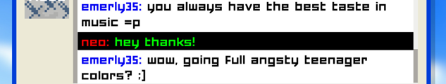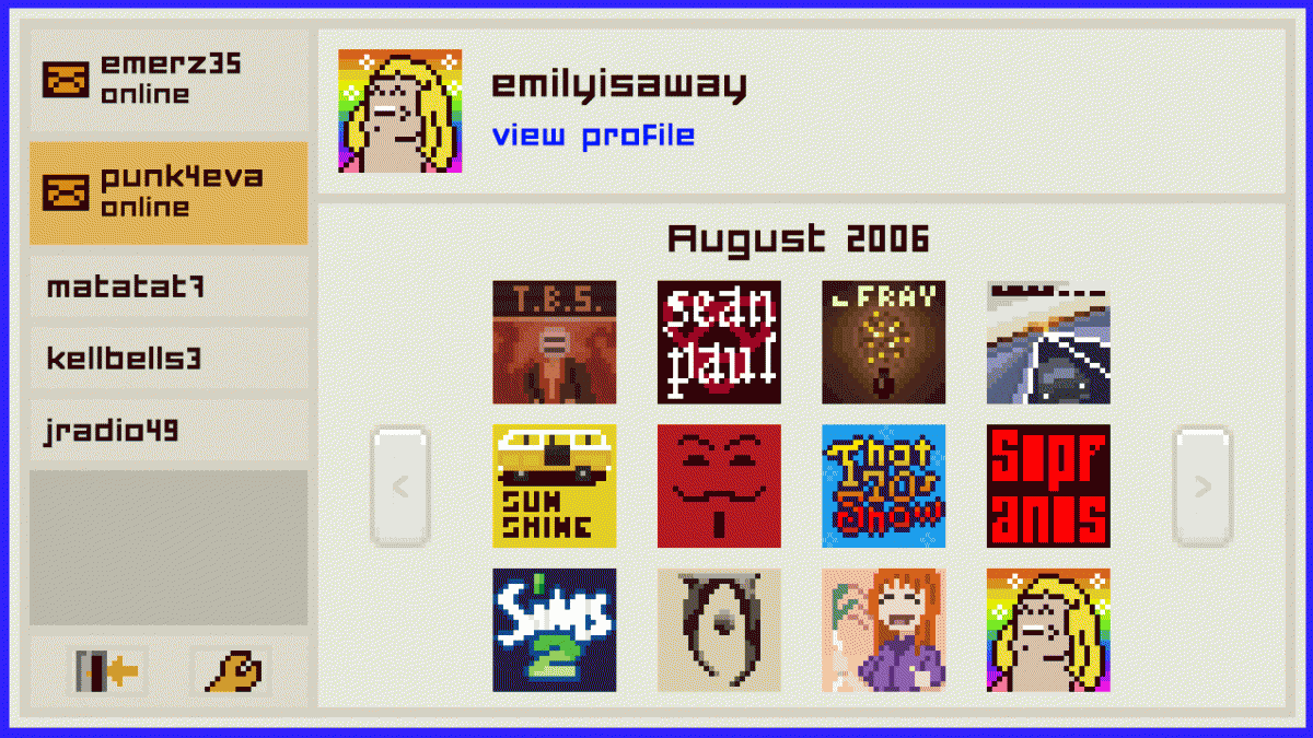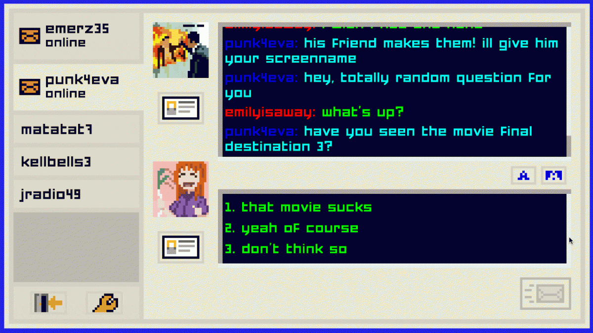 En espérant que le gameplay soit moins lourd que celui du premier! C'était original et bien pensé, mais ça finissait par être pénible. Puis bon, les différentes fins seront elles aussi les bienvenues. J'avais bien aimé ma première run d'Emily is Away, mais celles d'après m'ont dégoûtée : peu importe ce qu'on fait, la fin sera sensiblement la même, même le développement de l'histoire n'a pas grand différence, il y a des messages qu'Emily ignore complètement (elle n'y répond pas et passe à autre chose: belle illusion de choix!)... bref, vous pouvez voir l'amour que je porte pour ce jeu