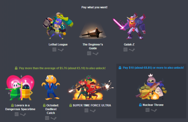 Au premier palier en prix libre, on trouve Galak-Z, un shooter 2D dans l'espace, ainsi que Lethal League, le jeu multi dans lequel les joueurs doivent se projeter une balle dessus à vive allure. Le jeu narratif The Beginner's Guide est aussi de la partie et permettra de vivre une histoire qui retourne sans prendre trop de risques sur l'achat.