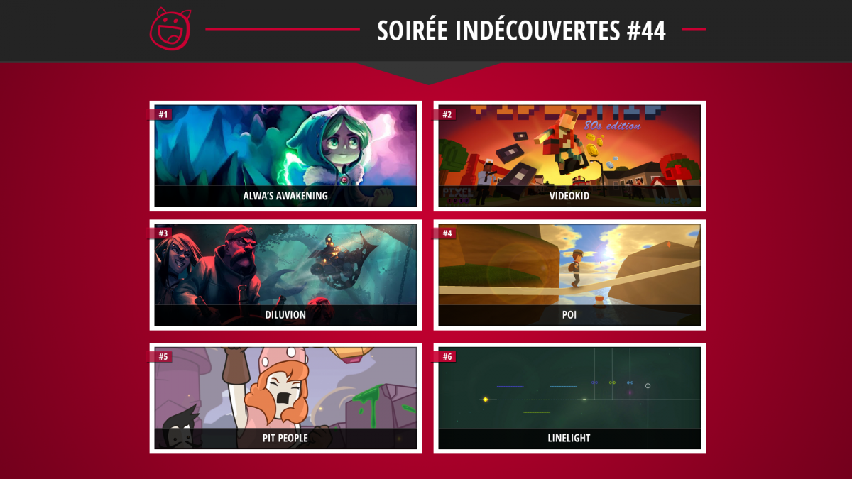 Au programme de cette 44e soirée, c'est le metroid-like à l'allure NES Alwa's Awakening qui ouvrira le stream, suivi par The Videokid, le paperboy-like dont l'objectif semble être de placer le plus de références possibles aux années 80. L'exploration maritime prendra sa suite avec Diluvion et son monde aquatique.