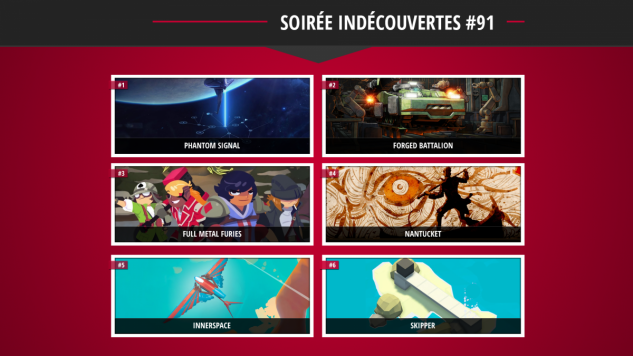 La soirée débutera avec Phantom Signal, un jeu de stratégie à base de nœuds dans l'espace dans lequel il faudra miner et construire ses défenses. Ce sera ensuite au tour de Forged Battalion d'étaler sa stratégie avec la personnalisation de troupes dans un RTS 3D. Full Metal Furies, nouveau jeu des créateurs de Rogue Legacy, nous mettra aux commandes d'un groupe de guerrières de choc dans un jeu d'action coopératif.