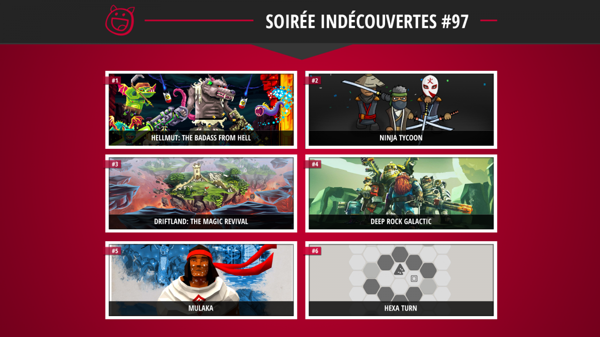 La soirée débutera avec Hellmut: The Badass from Hell, un twin-stick shooter avec diverses créatures fantastiques. On ira ensuite gérer un village de ninjas dans Ninja Tycoon avant de nous occuper d'îles volantes dans le jeu de stratégie Driftland: The Magic Revival.