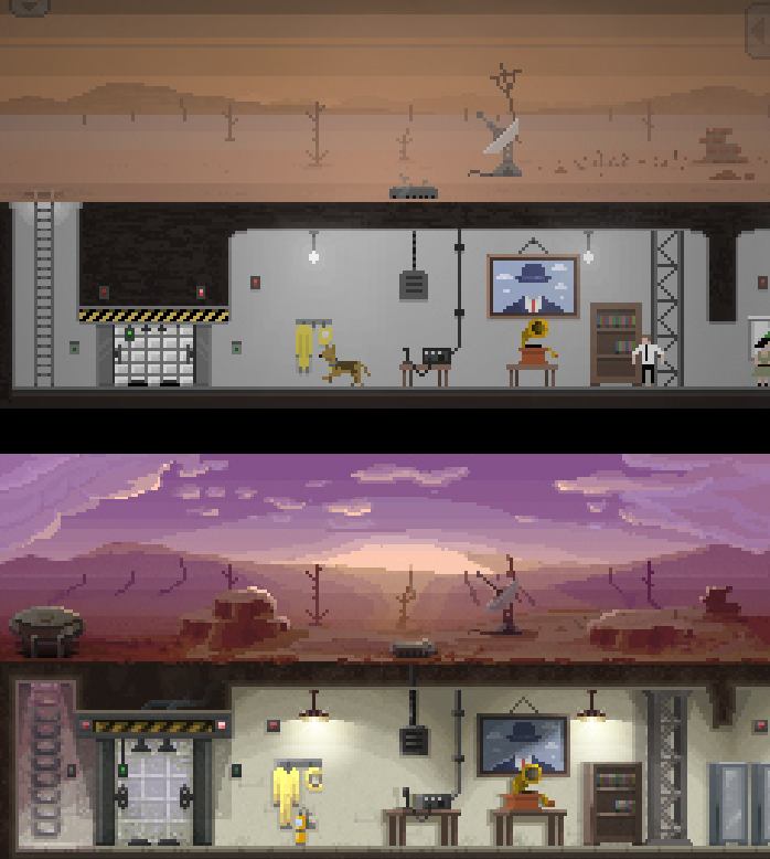Depuis, la Team 17, connue pour les Worms et plus récemment pour Flockers (un lemmings-like qu'on vous a testé), aide les équipes d'Unicube dont elle publiera le titre. Le jeu a donc profité d'une refonte graphique assez réussie, transformant le pixel-art ultra simpliste en quelque chose de plus fouillé dans les détails, avec un léger effet de profondeur dû notamment au changement de résolution. Ou vous laisse juger dans les images comparatives au dessus. Sheltered devait être accessible en alpha aux backers en décembre, mais le jeu a changé de moteur, et est passé de Construct 2 à Unity, ce qui explique le report à février 2015. La sortie définitive était prévu pour mai 2015, mais on peut plus sérieusement compter sur l'été. Les supports disponibles seront Windows, Linux, Mac, Ouya, Android, iOS, PS4 et potentiellement Xbox One.