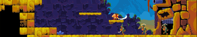 La palette de mouvement est relativement classique avec le saut, l'attaque ou la combinaison des deux. Une monture sera disponible également en cours de jeu. Les graphismes sont variés d'un secteur à un autre, tout comme les ennemis allant du soldat aux traditionnels oiseaux qui nous en veulent. Les nombreuses musiques composées par Jeff Ball sont comme le jeu dans un style rétro, mêlant des chiptunes épiques aux actions héroïques à l'écran.