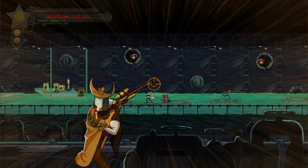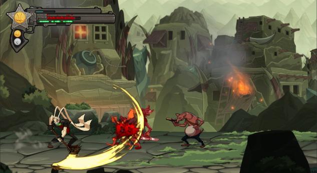 Comme de nombreux joueurs j’imagine, l’envie de m’essayer à ce Dusty Revenge a principalement été provoquée par son habillage graphique. De ce point de vue là, PD Design Studio a su peaufiner son projet pendant presque deux ans de développement. Le résultat à l’écran rappellera le rendu cartoonesque et gore de Shank avec un enchaînement de patelins poussiéreux, de saloons truffés d’ennemis, d’entrepôts désaffectés et de forêts luxuriantes fleurant bon le combat à chaque coin de baobab. Le jeu enchaîne plateforme exigeante (à parcourir à l’aide de vos immenses oreilles), combats de masse et affrontements contre des boss bien difficiles tout au long de ses neuf environnements. C’est beau, c’est propre, c’est plutôt bien animé dans l’ensemble mais on ressent assez vite un certain manque de variété voire une certaine monotonie dans les arrières plans. Rassurez-vous, ce détail ne viendra pas assombrir votre expérience de jeu… car un autre aspect de Dusty Revenge se chargera de le faire à merveille : son gameplay !