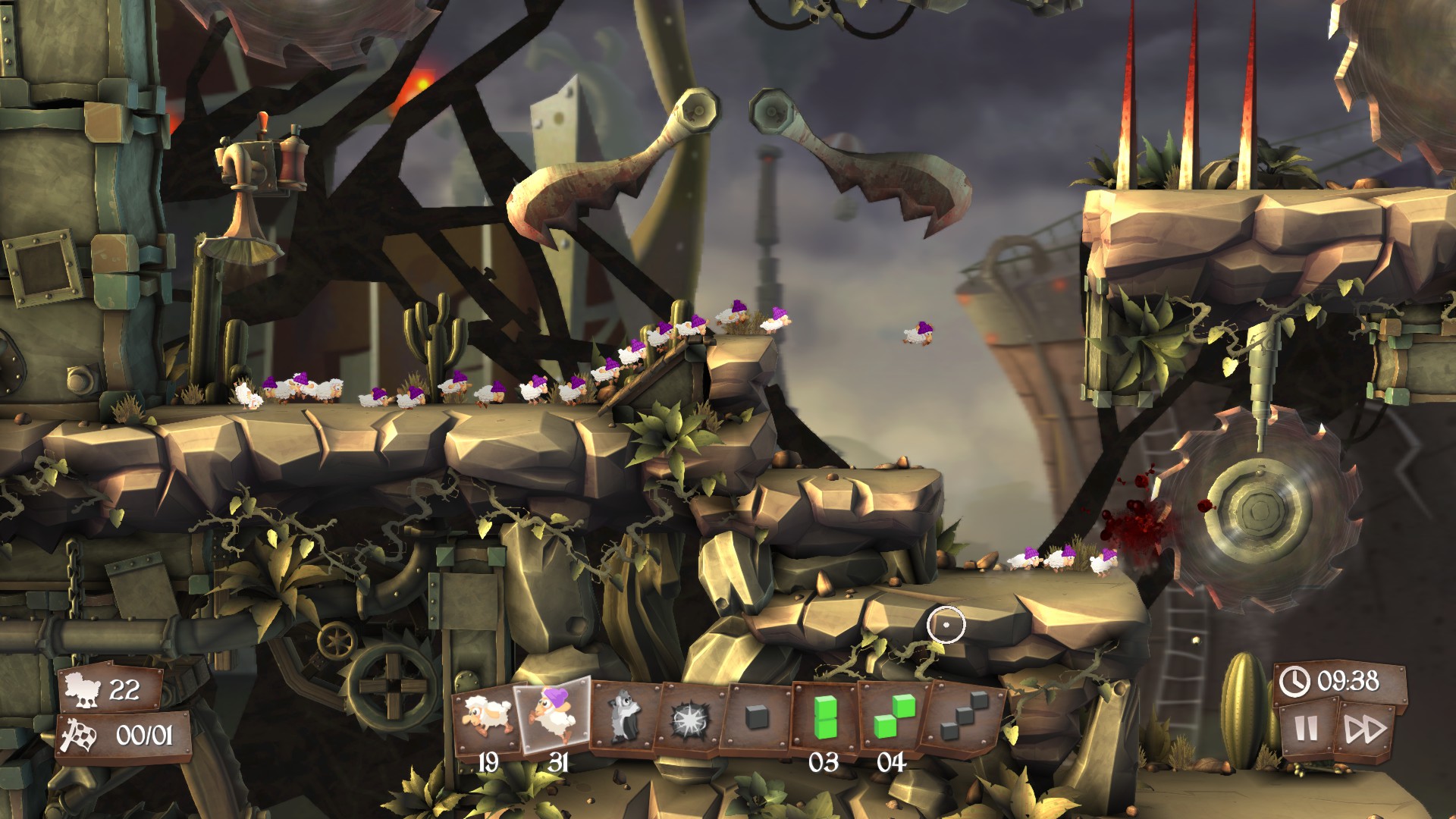 Malheureusement, Flockers ne nous a pas enchanté plus que ça. Le côté sanglant n'apporte rien de fun et les différents environnements ont une certaine froideur qui ne les rend pas agréables à parcourir. Malgré les bonnes trouvailles en matière de level-design, l'ambiance générale du jeu se retrouve plombée par ces choix de direction artistique. Il est évident que la Team 17 souhaitait, initialement, faire de Flockers un jeu drôle mais il se pourrait bien qu'ils aient changé d'optique en cours de route, ce qui donne un mélange étrange. Ensuite, côté gameplay, Flocker est solide. Il ne propose pas un nombre incalculable de pouvoirs, mais ceux présents suffisent à nous occuper un moment sans nous lasser. Les niveaux "spéciaux" seront d'ailleurs une bonne occasion de casser le rythme lent du jeu et il s'avèrent être parmi les plus intéressants. Pourtant, on pourrait dire qu'il manque un peu de folie et d'originalité dans tout ça. Alors qu'un Spirit se permettait de nous séduire de par son univers et qu'un Mousecraft nous apportait de la fraîcheur avec son système de Tetrominos, Flockers ne se contente que de faire le boulot, sans plus.