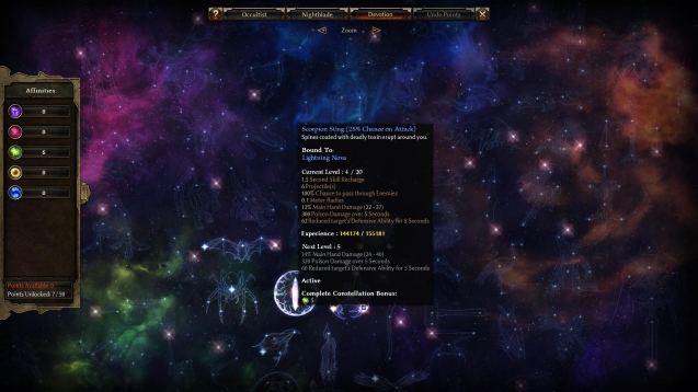 Si les Constellations apportent la majorité du temps des bonus passifs – plus de dégâts de poison sur les attaques ou des chances de coups critiques accrues – il existe également des compétences actives très puissantes qui sont à combiner avec d’autres compétences afin d’en cumuler les effets. Par exemple, en associant la Piqûre du Scorpion et sa zone de poison à la Nova de Foudre, qui crée une des éclairs autour de son personnage, nous obtenons une explosion électrique et empoisonnée. Autant vous dire qu’ici encore, les possibilités sont légions.