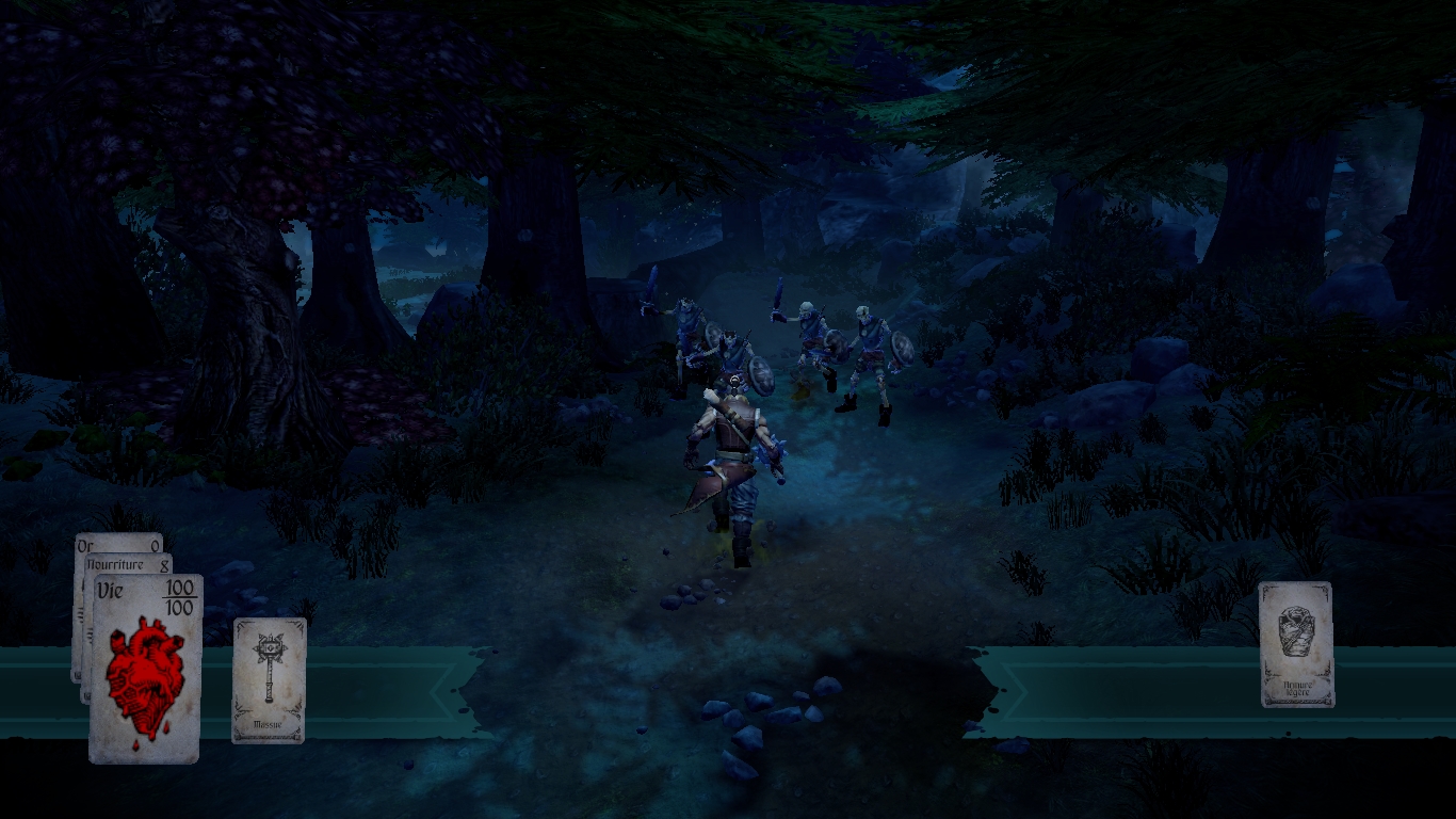Un étrange magicien encapuchonné, le Dealer, lance le défi suivant : vaincre douze figures majeures de son jeu de cartes. Ces figures, ou autrement dit, ces boss, se font appeler Valet de Sable, Dame de Crâne ou encore Roi de Peste. Afin d’accomplir cette besogne, le joueur aura à sa disposition un deck qui ne cessera, au fil des parties, de se garnir avec de nouveaux équipements ou de nouveaux événements. Hand of Fate semble donc en premier lieu être un jeu de cartes classique. Originalité de taille toutefois : la narration, très basique au demeurant, s’inspire des fameux « livres dont vous êtes le héros » puisque la progression du héros – un guerrier sans nom – se fait à travers un set de cartes événements disposées face cachée sur la table.