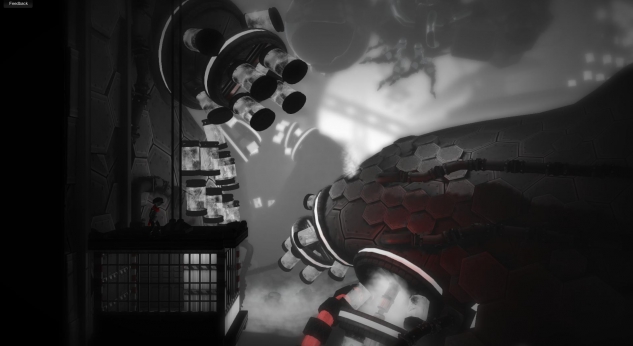 Enlevez ce "Monochroma c'est comme Limbo" de vos pensées, Nowhere Studios n'en a repris que la colorimétrie en y ajoutant quelques objets rouges clés dans la compréhension de la narration et du level design. En effet, il s'agit d'un jeu de réflexion plutôt simple de prime abord dans lequel on suit l'aventure d'un garçon qui cherchera à sauver son frère en le portant sur son dos durant un long périple. Si visuellement le titre n'a rien de spectaculaire à nous proposer, il dispose en revanche d'un univers atypique intéressant. L'histoire de Monochroma se déroule dans une année 1950 alternative à celle que l'on connaît, dans laquelle la robotique tient une place toute particulière. Cet aspect sera d'ailleurs au centre des éléments du décor, qui surprennent par moment de par l'ambiance qu'ils amènent si l'on est sensible à ce genre d'environnements.