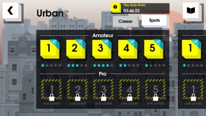 Si le fait de passer la ligne d'arrivée d'un niveau permet de passer directement au suivant, le principal intérêt de Olli Olli réside dans son système de missions. Dans chacun de 25 parcours, il faudra accomplir 5 missions qui peuvent se scinder en plusieurs catégories. Premièrement, ce sont deux objectifs de score que vous sont proposés : dépasser un certain score et réussir un combo de x points. Secondement, certaines missions concernent la récupération de collectables. Moins passionnantes et surtout assez difficiles la plupart du temps, ce sont celles que l'on redoute généralement dans les derniers niveaux. Enfin, il sera également demandé de réussir certaines figures précisément ou un combo utilisant plusieurs éléments indiqués par des marqueurs à l'écran. Techniquement, il sera simple et rapide de déverrouiller l'ensemble des environnements disponibles dans Olli Olli mais le principal de la durée de vie se verra surtout dans l'accomplissement du 100% symbolique. Ce dernier sera d'ailleurs amplifié car une fois les 5 étoiles remportées dans tous les stages en mode normal, il faudra s'attaquer à un mode difficile qui comporte lui aussi autant de missions à accomplir et qui est lui même suivi d'un mode extrême ! Sur de longues sessions, il faut bien avouer que l'on sent une certaine répétitivité à enchaîner toujours les mêmes genre d'objectifs et les différentes ambiances visuelles ne sont finalement qu'accessoires car le gameplay ne s'en trouve pas renouvelé. C'est en y jouant de temps en temps qu'on appréciera le soft. D'ailleurs, on y revient volontiers car les développeurs proposent un défi quotidien à accomplir : une piste modifiée chaque jour dans laquelle on n'aura un seul et unique essai pour faire un score maximal qui sera comparé à celui des autres joueurs. Arriverez-vous à vous hisser quotidiennement en haut du classement ?