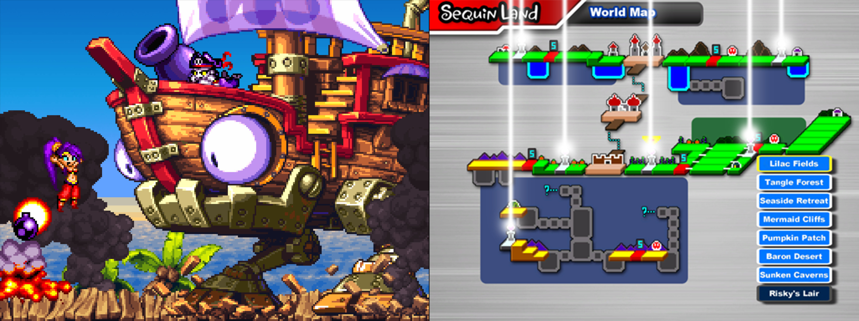 Shantae est une fille demi-génie qui réside dans Sequin Land, un pays coloré où cohabitent humains et monstres. Alors qu'elle pionçait gentiment dans sa maison, son ennemie jurée Risky Boot refait surface aux commandes d'un bateau pirate pour emporter avec elle une lampe étrange qui n'est pas sans rappeler celle d'un certain Aladdin. Afin de contrer sa rivale, elle devra récupérer plusieurs sceaux magiques en parcourant les quatre coins du monde ! Si la naïveté de la trame principale et l'aspect très coloré du soft nous laissent croire que Shantae : Risky's Revenge est tout public, sachez qu'il n'en est rien une fois manette en main ! En effet, il sera question ici d'exploration avant tout, avec de nombreuses phases de plateforme exigeantes demandant un sens de l'orientation à toute épreuve pour ne rien oublier sur son chemin. Techniquement, WayForward affiche une parfaite maitrise du pixel-art et de son animation, même sur un grand écran le jeu reste impressionnant grâce à de nombreux détails qui viennent flatter la rétine notamment durant les combats de boss.