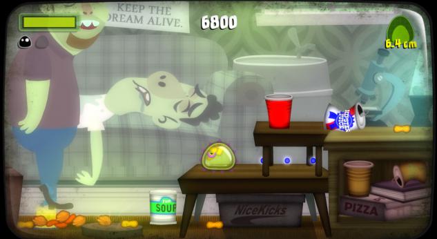 Plusieurs capacités s'offrent à vous : le saut, le plongeon, le walljump et tout ce qui concerne l'interaction avec le décor via l'écran tactile. Là où certains jeux du même genre se contentent de proposer un bête chemin demandant au joueur d'aller de gauche à droite, Mutant Blobs Attack proposera des zones fermées par un bouchon qu'il faudra ingérer, à condition d'être suffisamment gros. Comment faire ? Il faudra explorer certaines zones pour y dénicher tout ce qui pourrait faire office de nourriture. Caisses, plots, légumes, voiture, humain... tout ce qui vous tombe sous la main ! Dans les niveaux avancés, ce seront surtout des salles de "casse-tête" qu'il faudra traverser. Il sera souvent question d'utiliser l'écran tactile pour déplacer certains éléments (indiqués en vert), tout en jouant. Je ne vais pas vous mentir, ces phases ne sont pas toutes plaisantes à jouer. Lorsqu'on vous demande d'avancer, plonger, sauter, rebondir contre les murs tout en faisant tourner un mécanisme en continu avec l'écran tactile... ça relève de la torture digitale. Pour le reste, c'est fun !